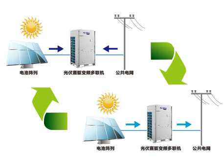 光伏發電系統不發電,主機向電網取電運行,機組相當于常規直流變頻多聯機。 | 純光伏發電工作模式